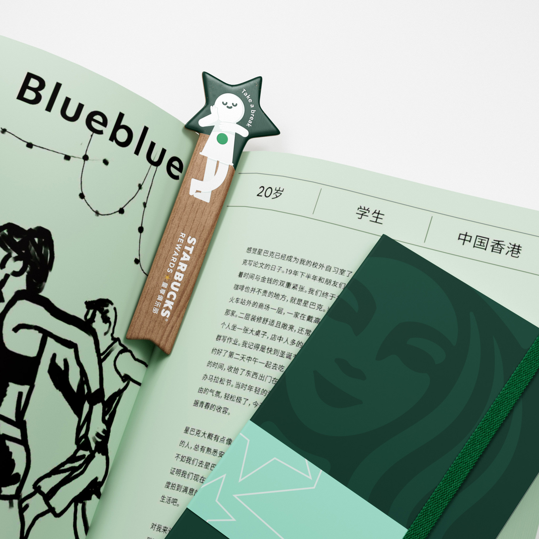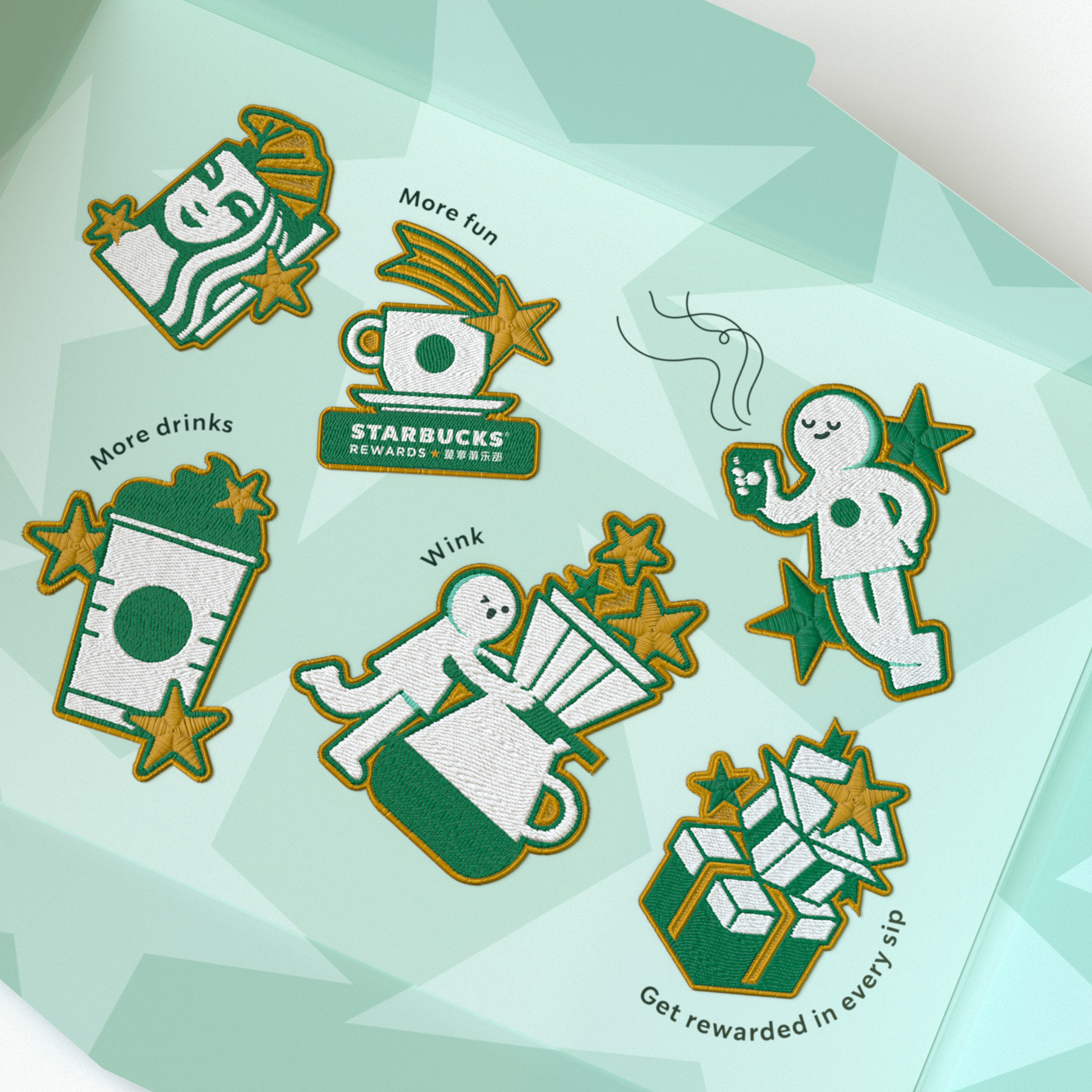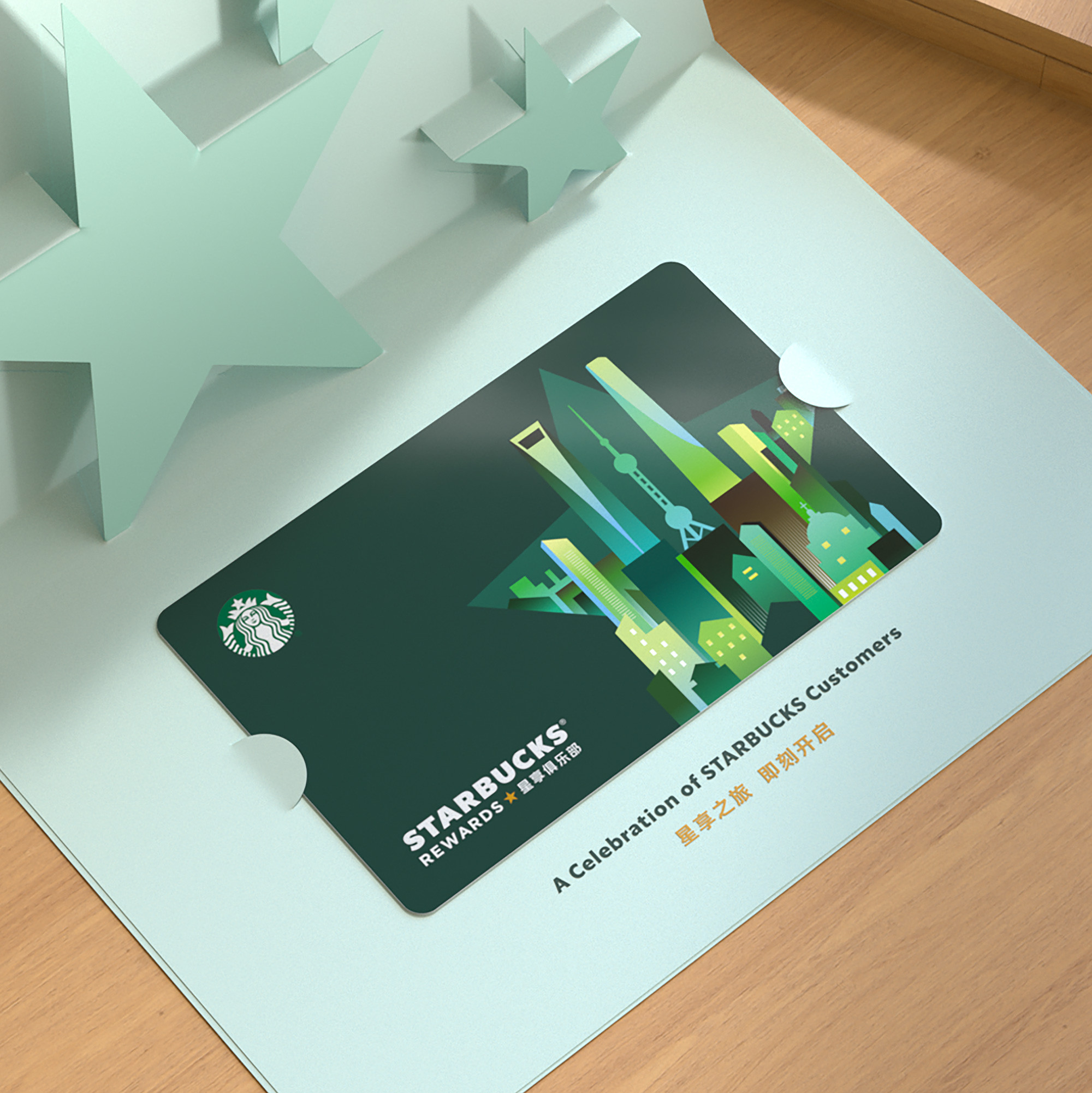 我们提取品牌名中的“星”字,使“星星”这个元素成为贯穿此次设计的线索。在标识设计中,我们将星融入字体中。字体设计不做过多的变形,标识呈现上延续星巴克的简约现代感,但在细节处窥见巧思,笔画多处使用圆角处理,观感上柔和且亲切。